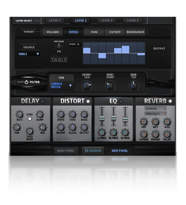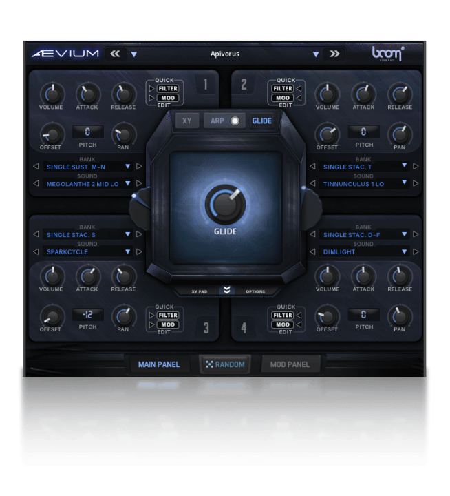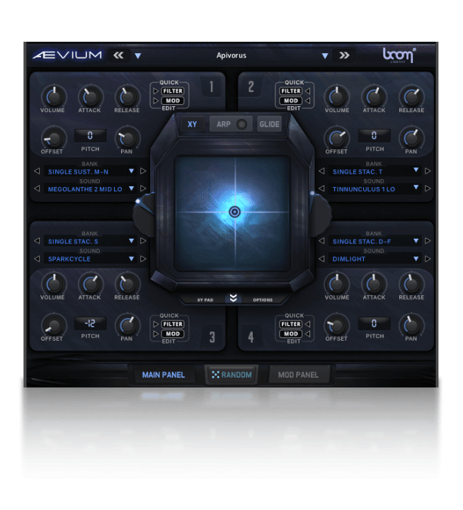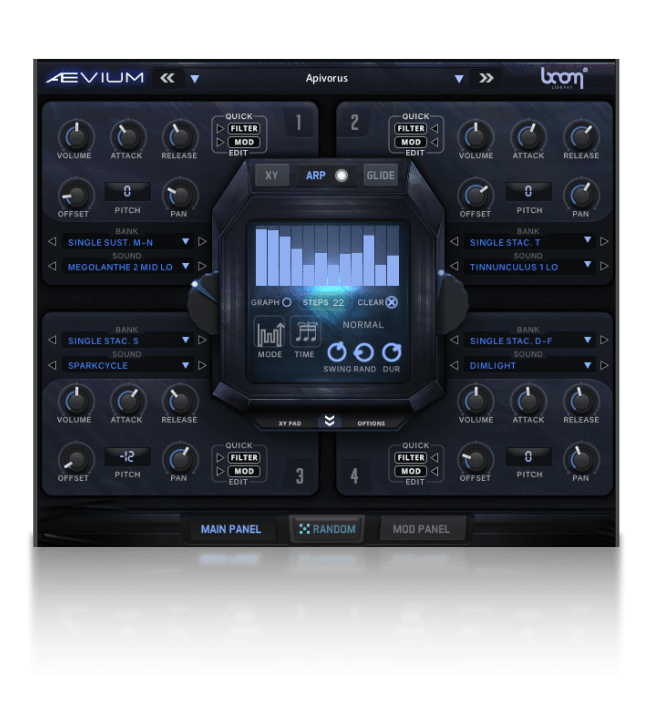 The main user interface is built around four separate quadrants, an assignable XY Pad, quick modulator + filter routing menus, and arpeggiator system to expand your creative potential. Each layer has fully independent sound-shaping options including Attack, Release, Offset, Pitch and Pan. Every quadrant has its own individual filter with 39 built-in filter types, as well as modulators using a variety of sources: LFO, ADSR and Velocity with 5 selectable targets: Volume, Pitch, Pan, Filter Frequency, Filter Resonance.
