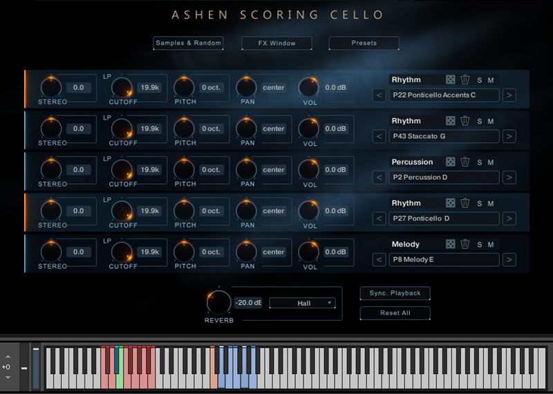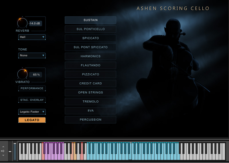 Ashen Scoring Cello is built primarily for film composers looking for a unique and idiosyncratic voice. It includes some standard repertoire like sustained legato and pizzicato, but it’s also got some really great articulations like strumming with a credit card, a very nasty sul ponticello, and even percussion on the cello body.