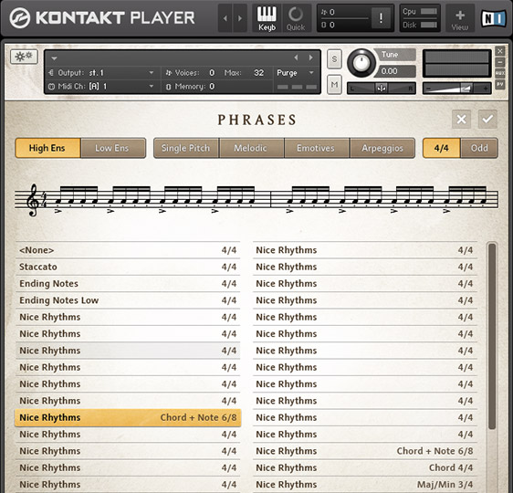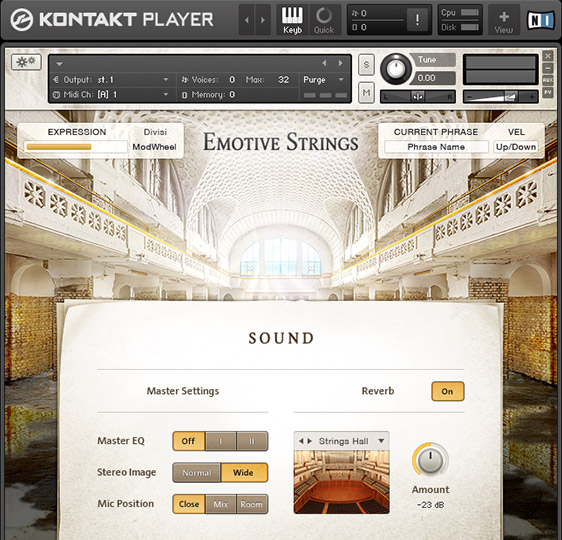 The EMOTIVE STRINGS library contains 175 phrases, which were performed live by a full string orchestra and were recorded with two microphone settings: Stage and Far. In addition to that, EMOTIVE STRINGS features 64 Themes, each of which represents a selection of up to 5 phrases that work well together.