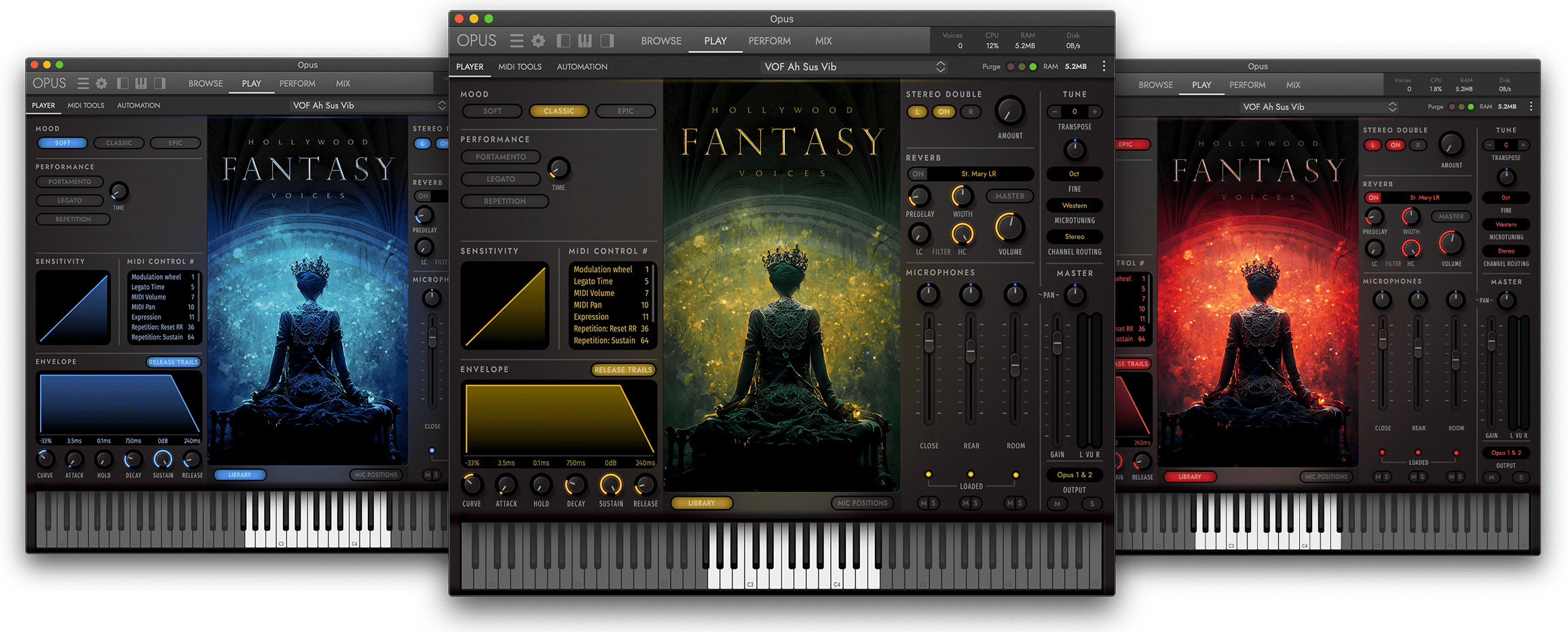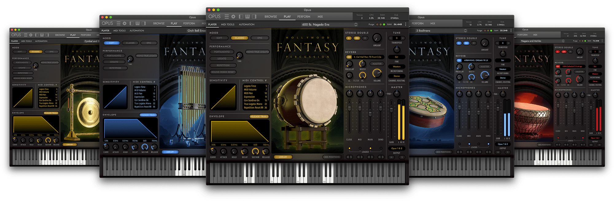Traditional celli are replaced with a viola da gamba ensemble, violins are replaced with a hardanger fiddle ensemble. Lutes and dulcimers are recorded in trios, creating a beautiful sparkling stereo image that cuts through any mix. It also includes hurdy gurdies and traditional high and low string ensembles, recorded in octaves for those moments when you need bombast to round out your fantasy sound. For every instrument in the Hollywood Fantasy Orchestra series, you can choose from 3 Moods – Classic, Soft, and Epic – which will instantly change the mic mix, reverb, and dynamic layer emphasis of that instrument to perfectly match the “mood” your composition needs, giving you full control over the dimension of the sound.
