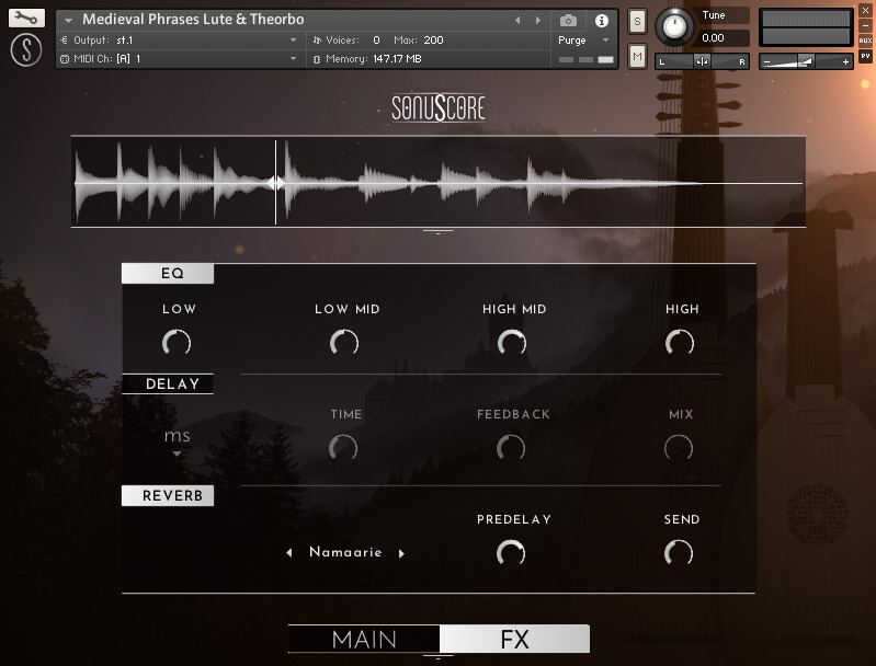 MEDIEVAL PHRASES LUTE & THEORBO includes a whole set of modern tools, including 4-band EQ, delay, and reverb. Have instant and easy access to the most essential features to craft your sound to perfection.