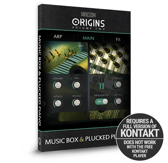 The Origins series returns with new carefully recorded instruments. This time we present to you the incomparable MUSIC BOX together with the sinister PLUCKED PIANO. Play the instruments individually or unleash the true power of ORIGINS with an interplay of both instruments by the powerful Multi-Arpeggio Designer (MAD) that lets you get the highest quality, creative results in the fastest time possible. The rhythmically interacting and enriching interplay of the music box and the plucked piano offer the best possible basis to create eerie, anticipation building or dreamy moods on the fly.
