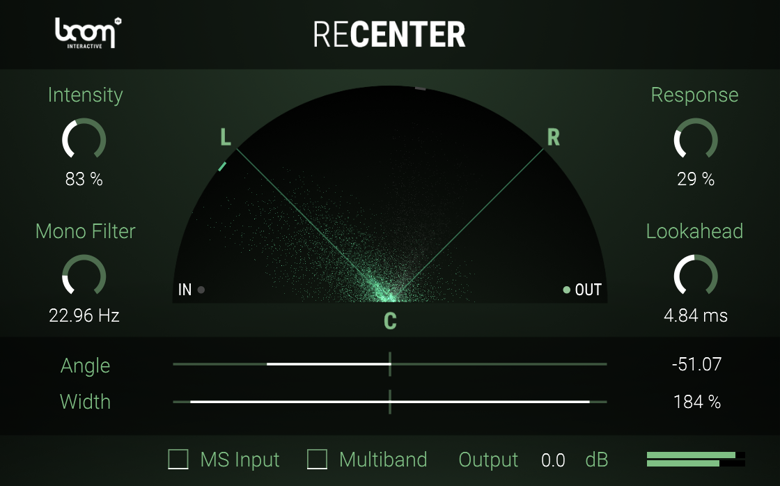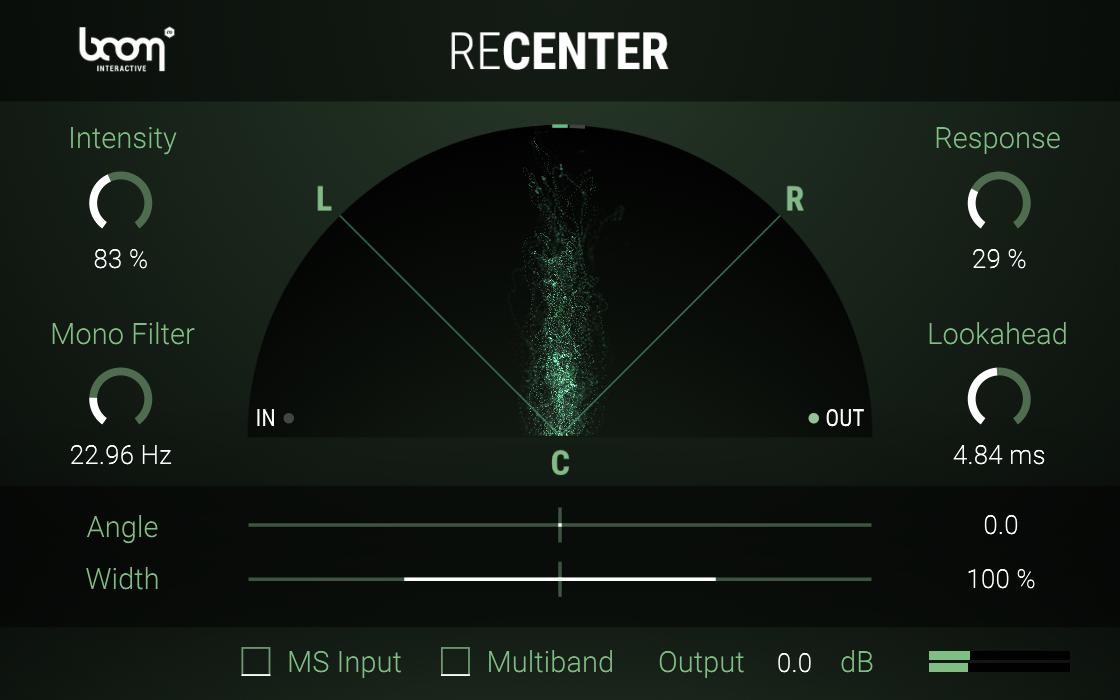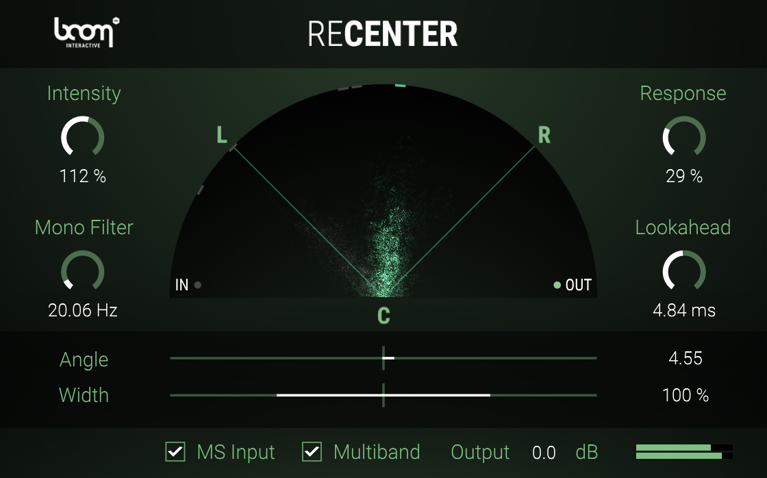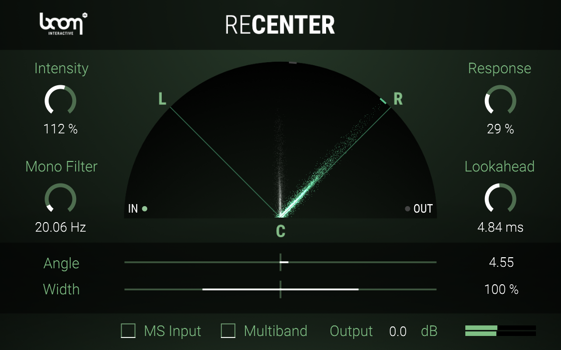 ReCenter is a stereo processor that constantly analyses an incoming stereo signal and dynamically rotates it to the center or a given angle without altering the stereo width. Having the incoming signal centered, you can narrow or widen the stereo image within ReCenter. For a better low frequency control you can mono the original signal below a set frequency. A multiband processing option intelligently shifts more complicated signals.