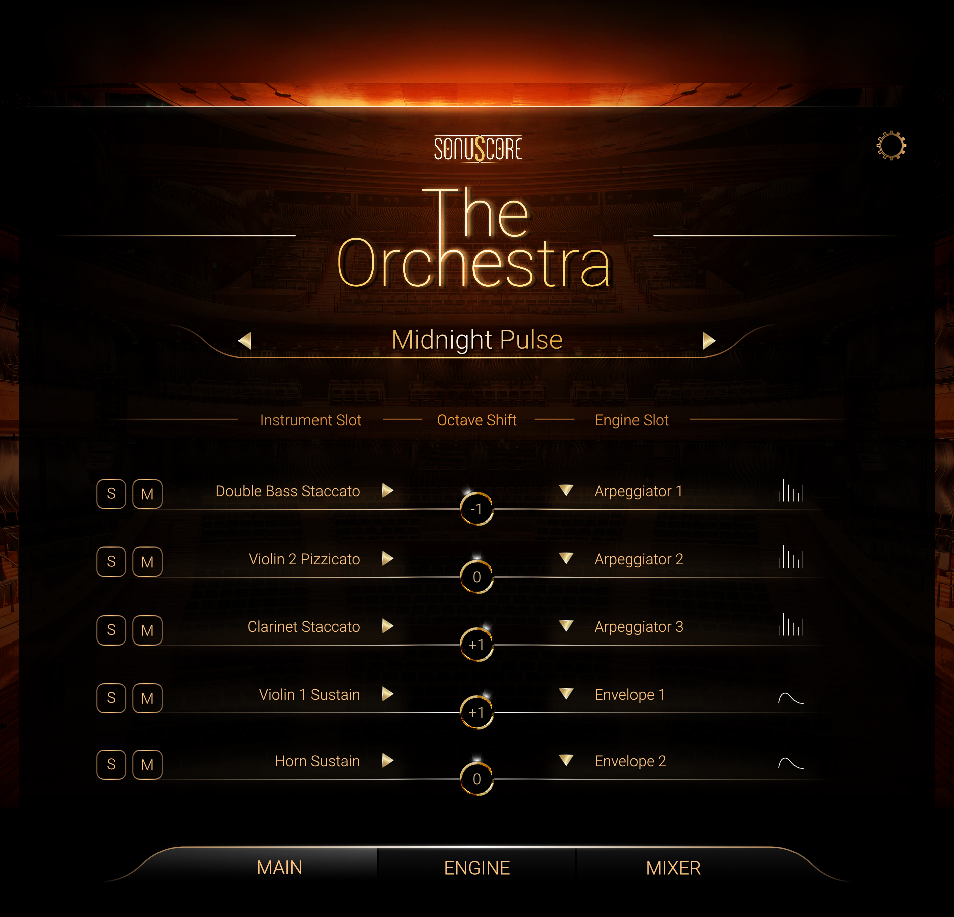 On the Engine page you can access all individual controls for each of the five orchestra library instrument modules.